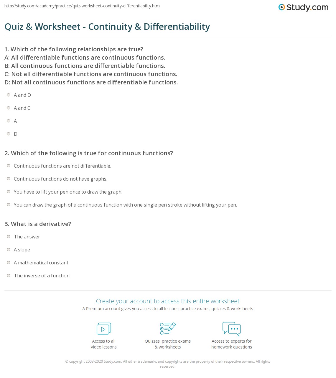 Calculus Continuity Worksheet / Limits And Continuity Calculus 1 Math Khan Academy /. Is it the biggest number? We have differentiation tables, rate of change, product rule, quotient rule, chain rule, and derivatives of inverse functions worksheets for your use. F worksheet by kuta software llc ap calculus name_____ date_____ ap® calculus ab/calculus bc 2018 scoring guidelines 22 cos 3 2cos cos 3sin 4sin cos dy y r d dx x r d answer θθ θ θ θθ θ θ aug 26, 2016 · ap calculus ab exam review limits and continuity multiple choice. Is it even a number at all? 07.02.2018 · here is a set of practice problems to accompany the chain rule section of the derivatives chapter of the notes for paul dawkins calculus i course at lamar university.